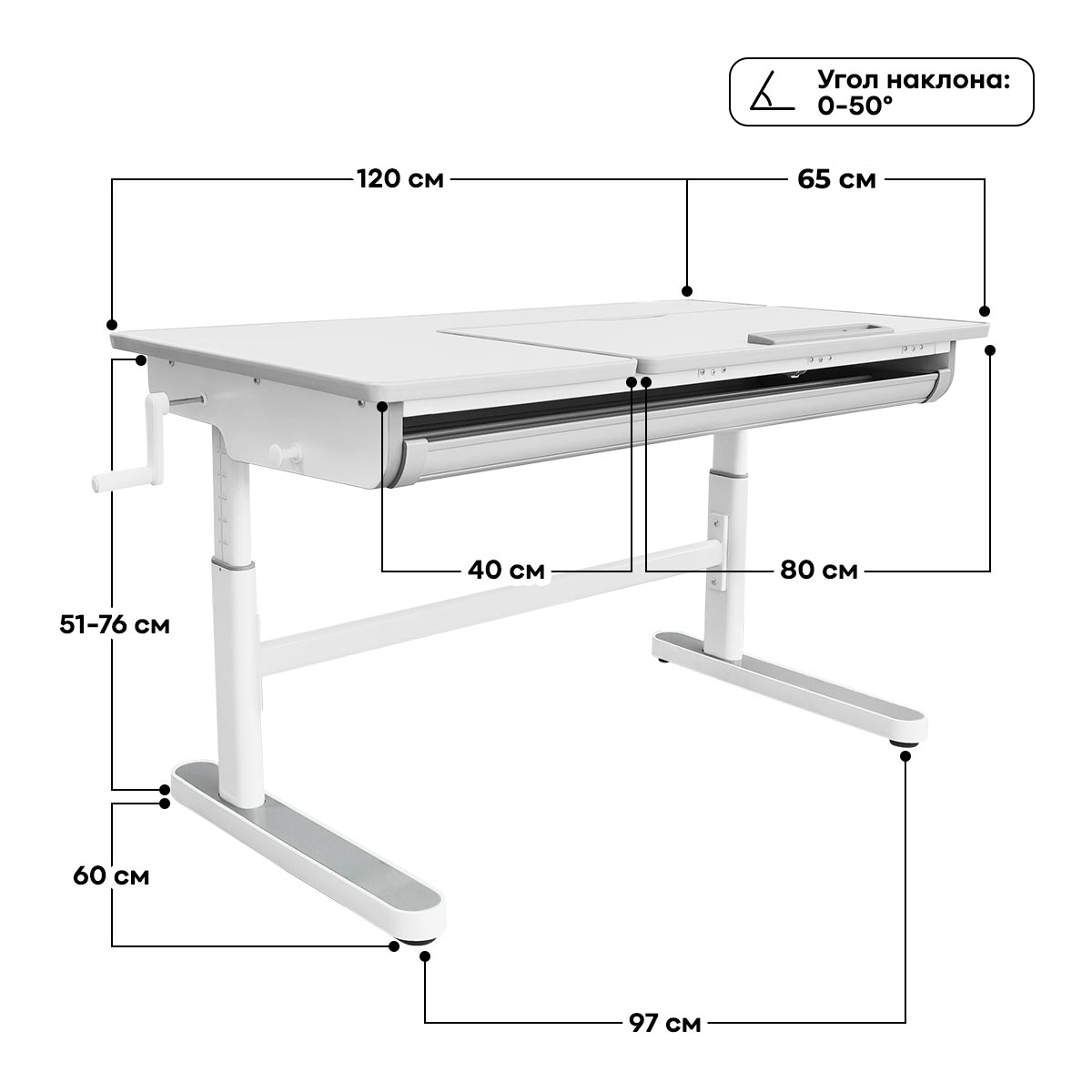 Тип регулировки высоты механический - по бокам парты расположены съемные ручки-трещотки. Покрутив их по часовой стрелке - вы поднимете парту выше, а если начать крутить ручку против часовой стрелки - парта начнет опускаться вниз. Менять высоту парты очень легко, с таким занятием справится даже ребенок.