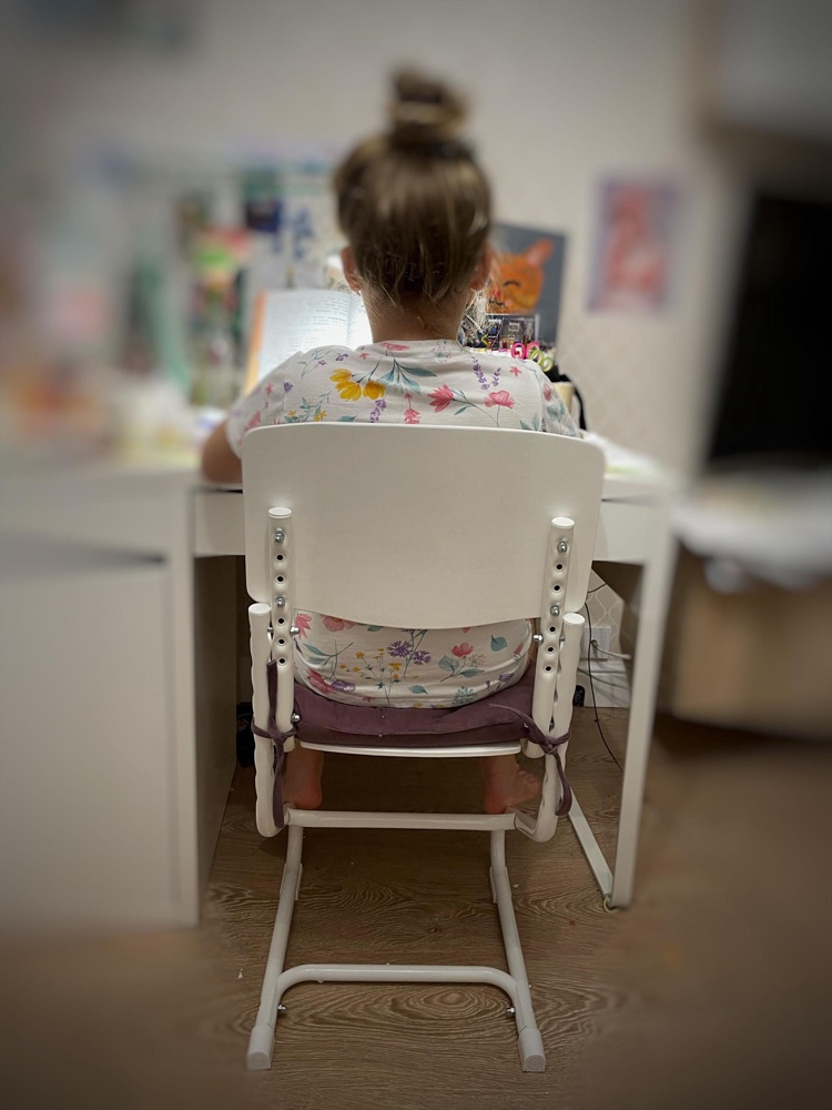 Регулировка таких ключевых характеристик как: высота спинки, глубина сиденья, высота стула - способствует формированию естественной, красивой осанки у пользователя. Ребёнок сидит в правильной позе, руки на столешнице, ноги согнуты в коленях под прямым углом 90°, у спины правильная, твёрдая опора - спинка стула.